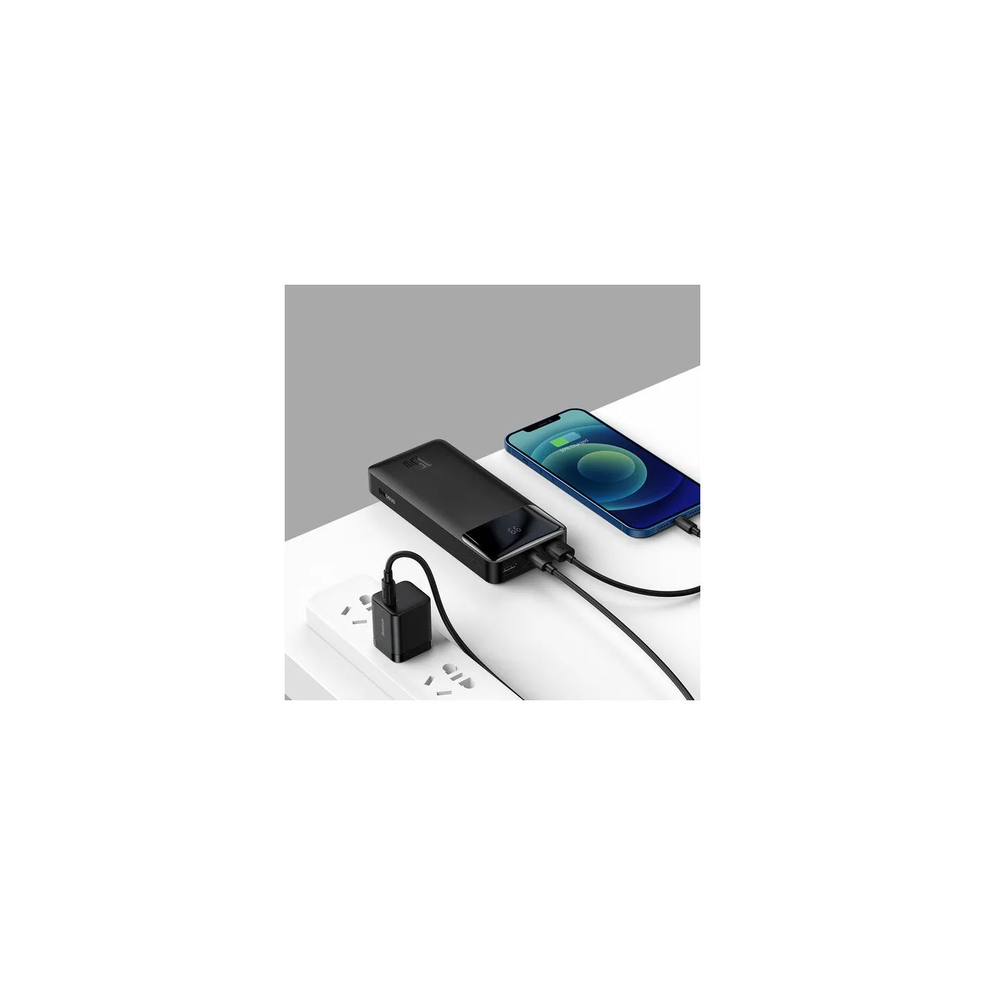 Z maksymalną mocą 20W poprzez kabel typ-c na typ-c, czas ładowania power banka od 0 do 100% wynosi około 7,5 godzin.