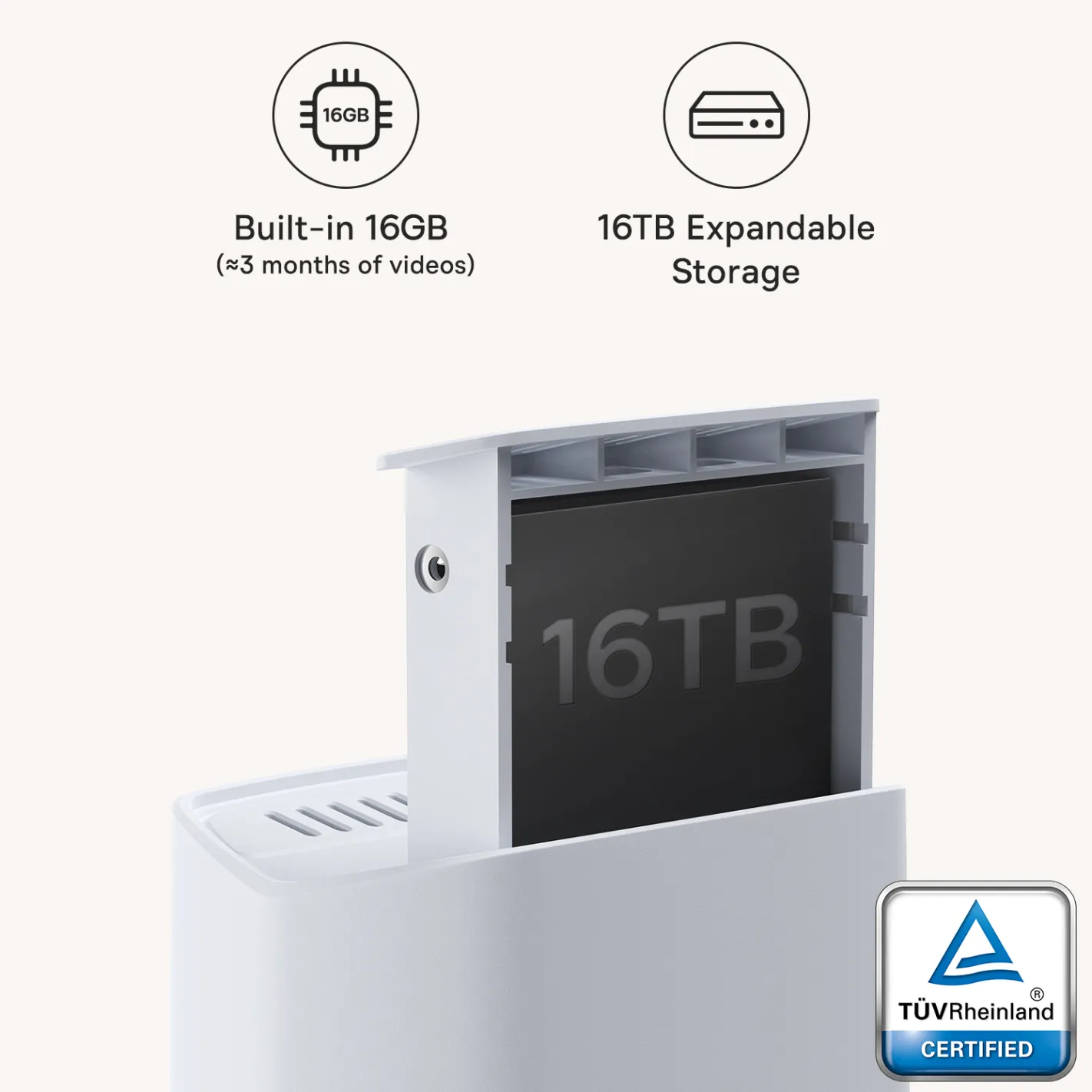 Dzięki stacji bazowej Home Station z wbudowaną 16GB pamięcią EMMC, możesz zapisywać nagrania do 3 miesięcy, bez ukrytych kosztów i konieczności wykupywania subskrypcji w chmurze. Możliwość rozszerzenia pamięci aż do 16TB (dysk do kupienia osobno) zapewnia dodatkową przestrzeń na nagrania.