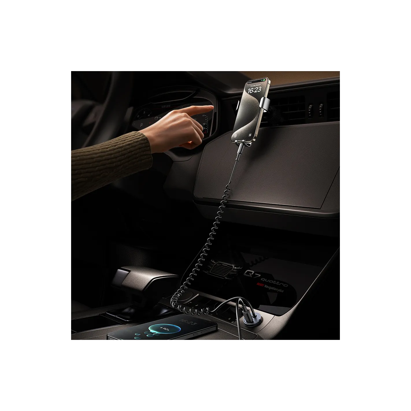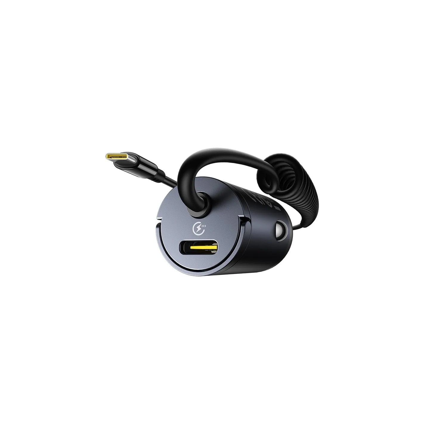 Dzięki wbudowanemu kablowi sprężynowemu o długości 1,4 m oraz dodatkowemu portowi USB-C, możesz ładować dwa urządzenia jednocześnie – zarówno swoje, jak i pasażera. Sprężynowy kabel nie plącze się i automatycznie zwija po odłączeniu.