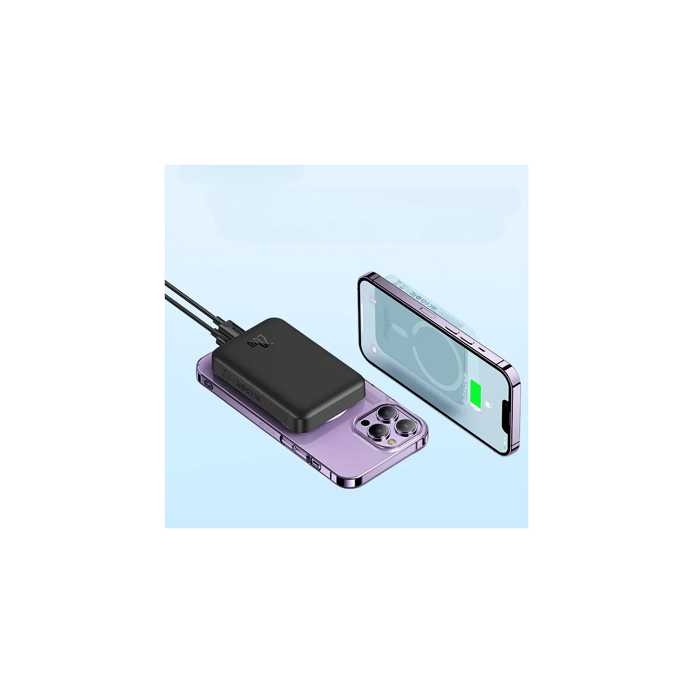 Power bank oferuje dwa tryby ładowania – przewodowe i bezprzewodowe. Dzięki portowi USB-C obsługuje szybkie ładowanie przewodowe do 20W, a wbudowana cewka indukcyjna pozwala na ładowanie bezprzewodowe z mocą do 15W. Kompatybilność z wieloma protokołami sprawia, że urządzenie obsłuży zarówno iPhone’y serii 12/13/14, jak i smartfony z Androidem wyposażone w ładowanie indukcyjne. Dodatkowo funkcja Auto-Wake automatycznie uruchamia proces ładowania po podłączeniu lub przyłożeniu telefonu – bez konieczności wciskania przycisków.